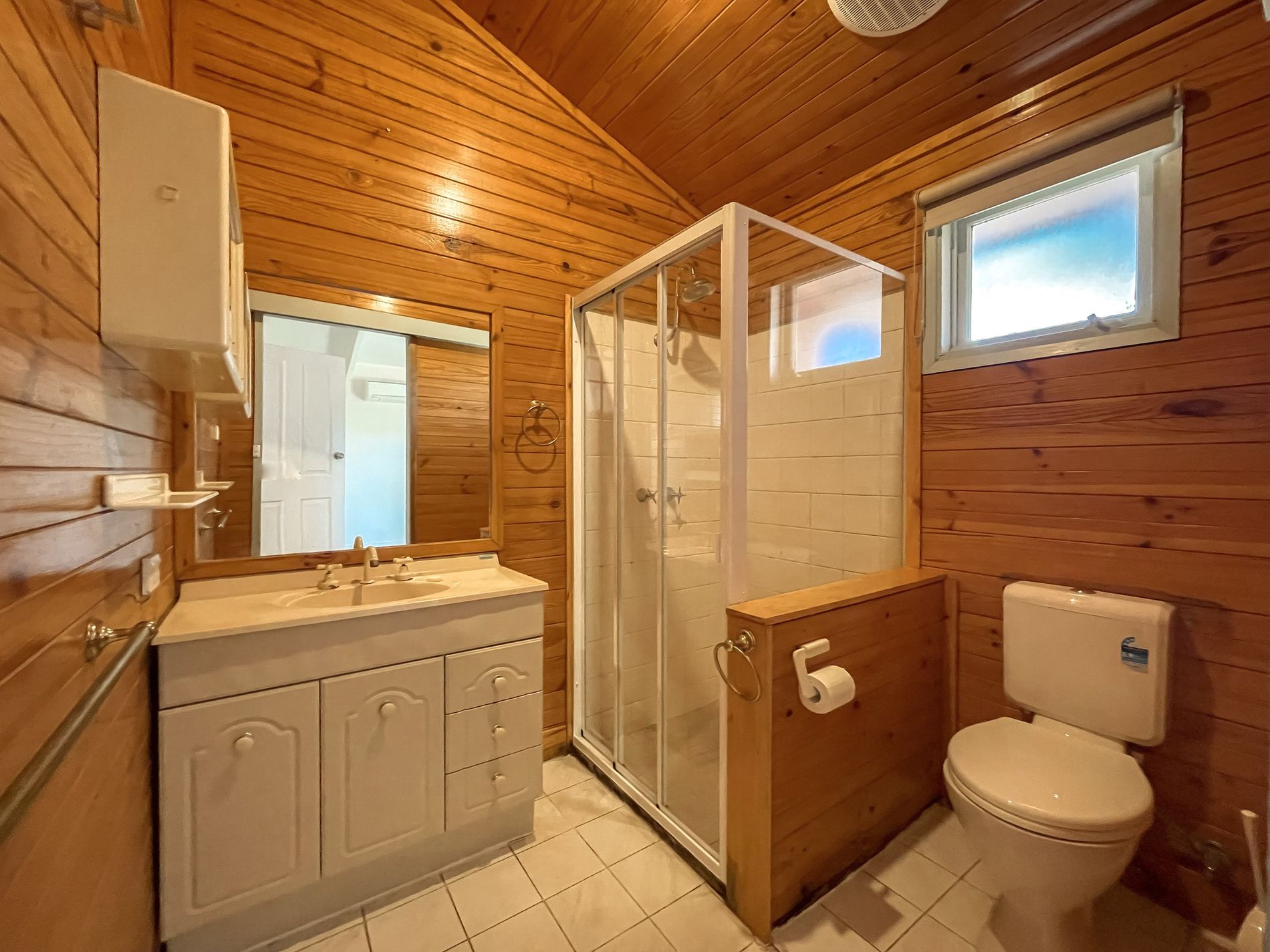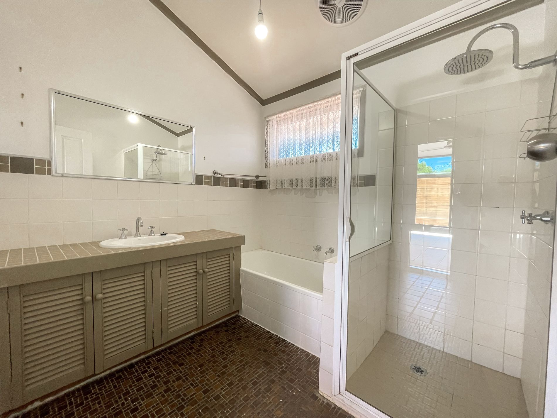 • Tiled bathroom with a shower, bath and vanity