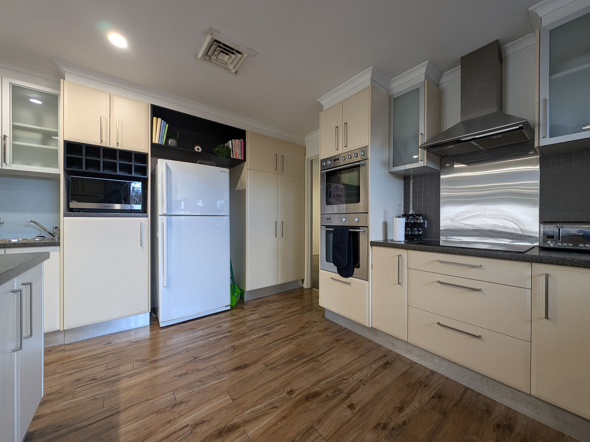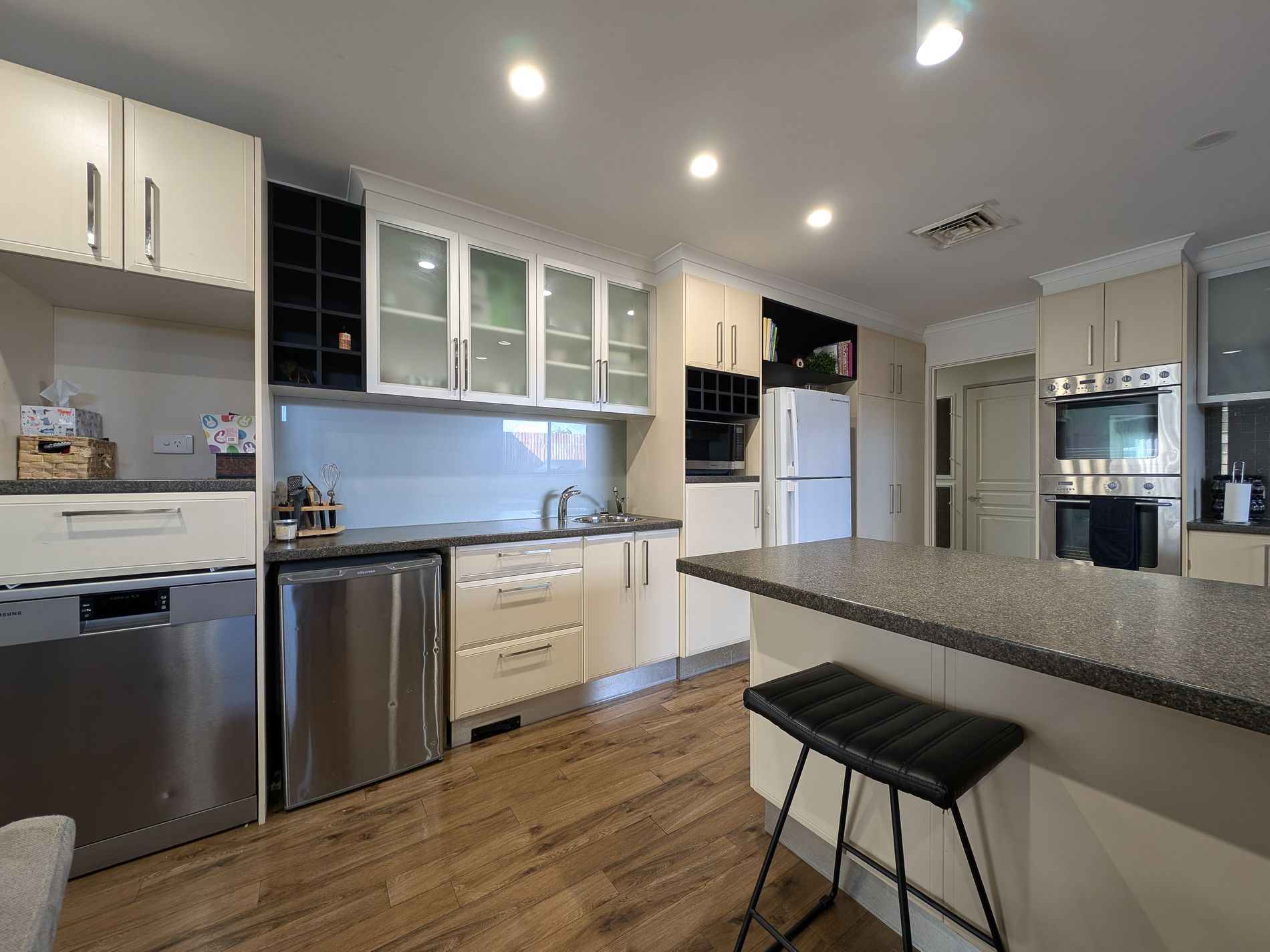 Dining & Kitchen: Adjacent to the living space, the dining area flows effortlessly into the kitchen—truly a chef’s dream! The kitchen is fully equipped with two ovens, two dishwashers, electric cooktop, breakfast bar, and abundant storage and bench space.