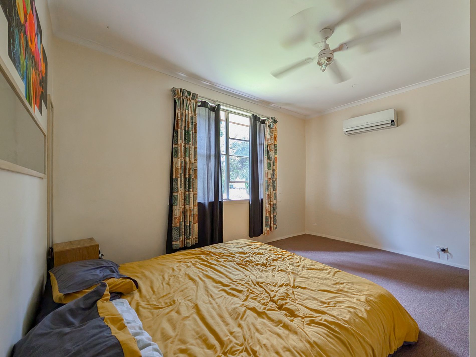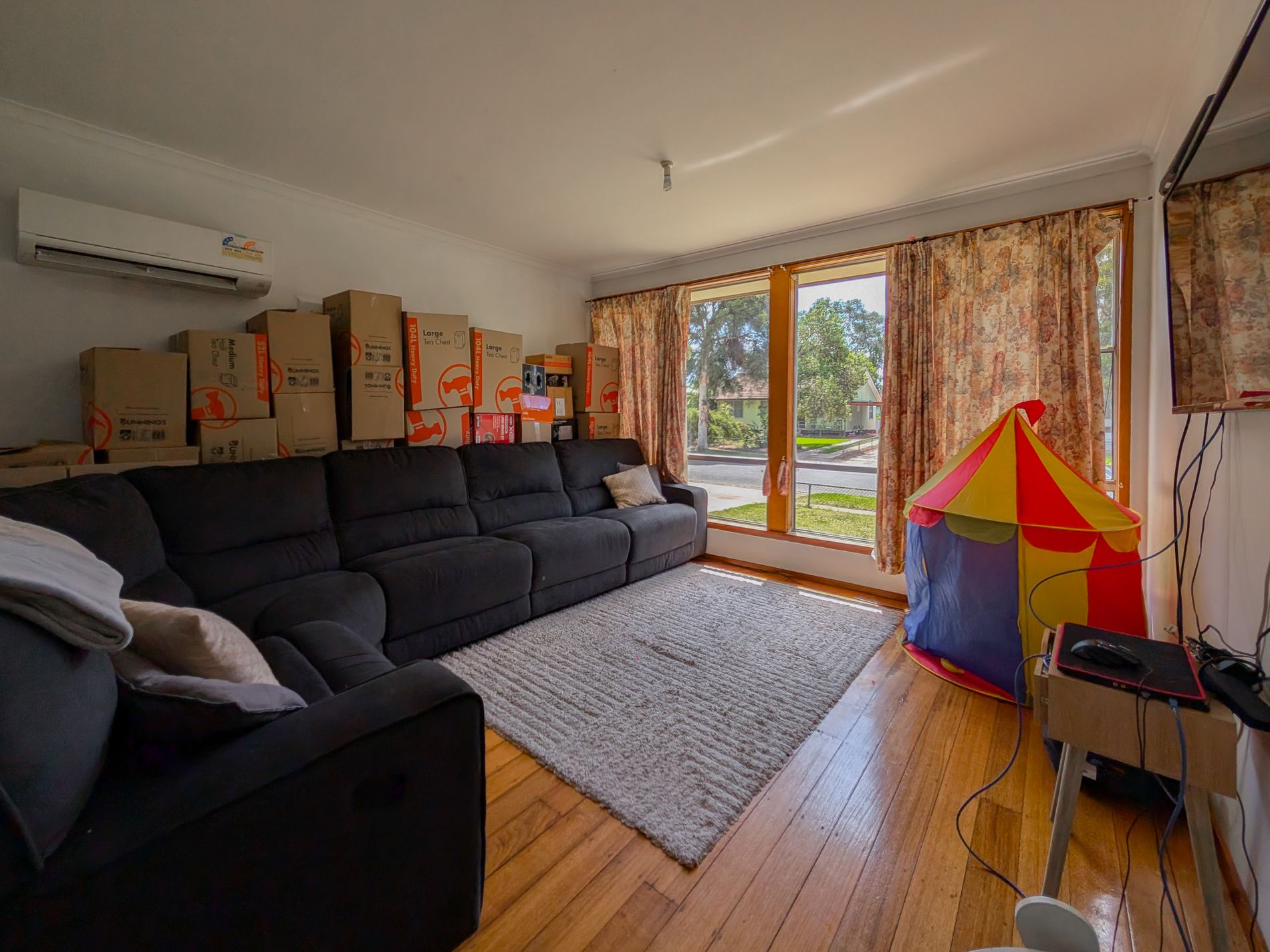 The kitchen is a generous and functional space, featuring electric cooking facilities and ample cupboard storage. The lounge room offers polished floorboards and is complemented by split system heating and cooling for year-round comfort.