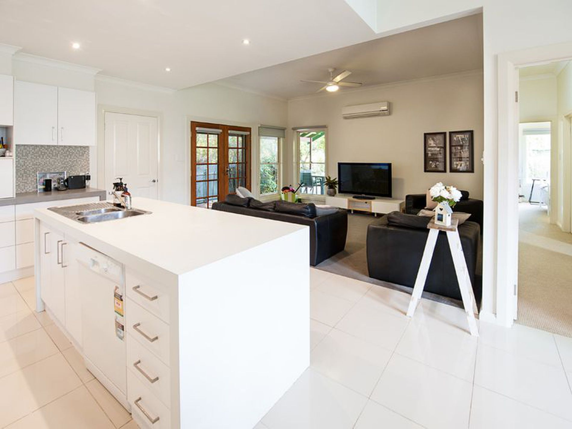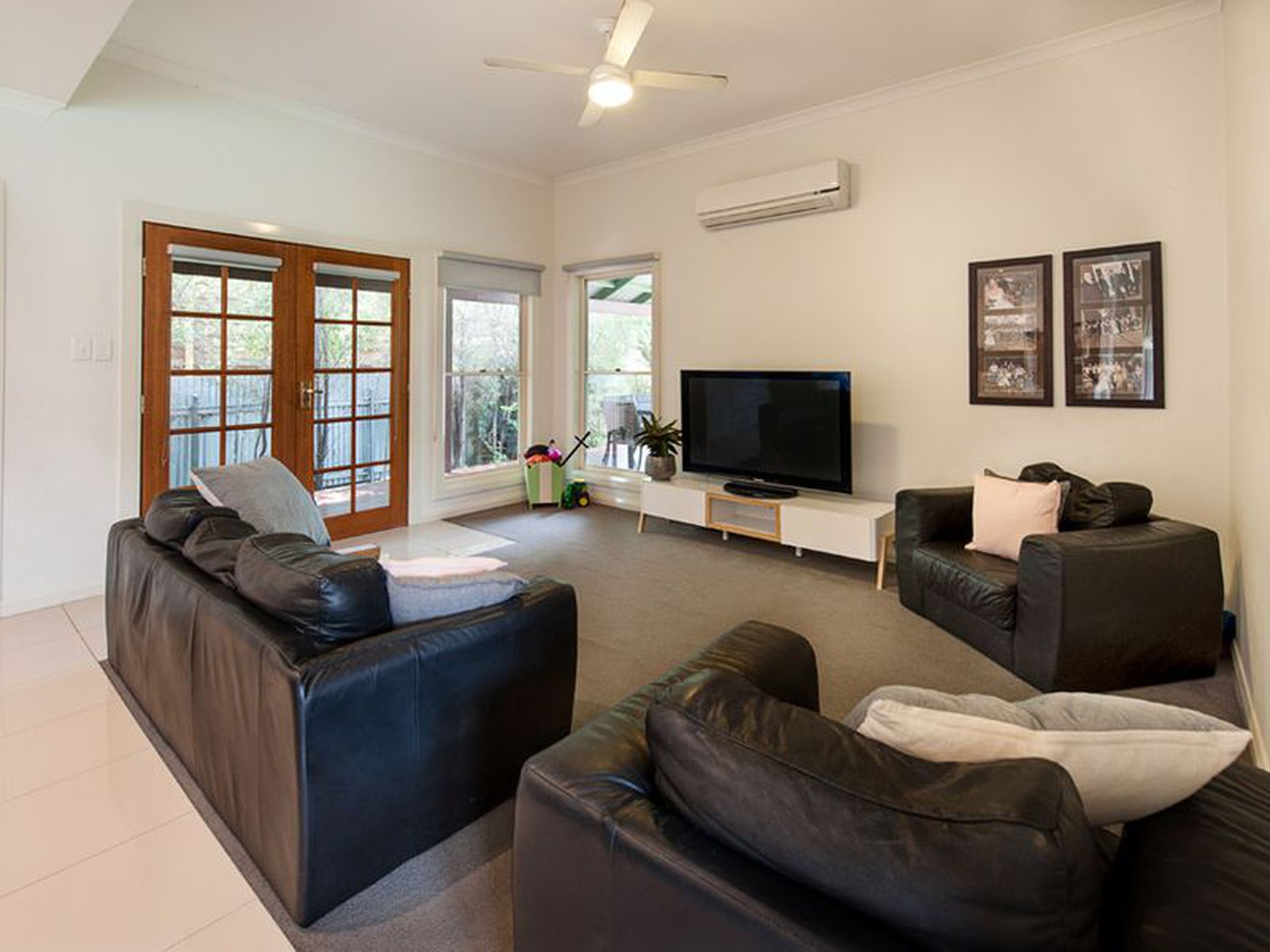 • Attractive open living area with french doors to the alfresco area, carpet, split system a/c and a ceiling fan.