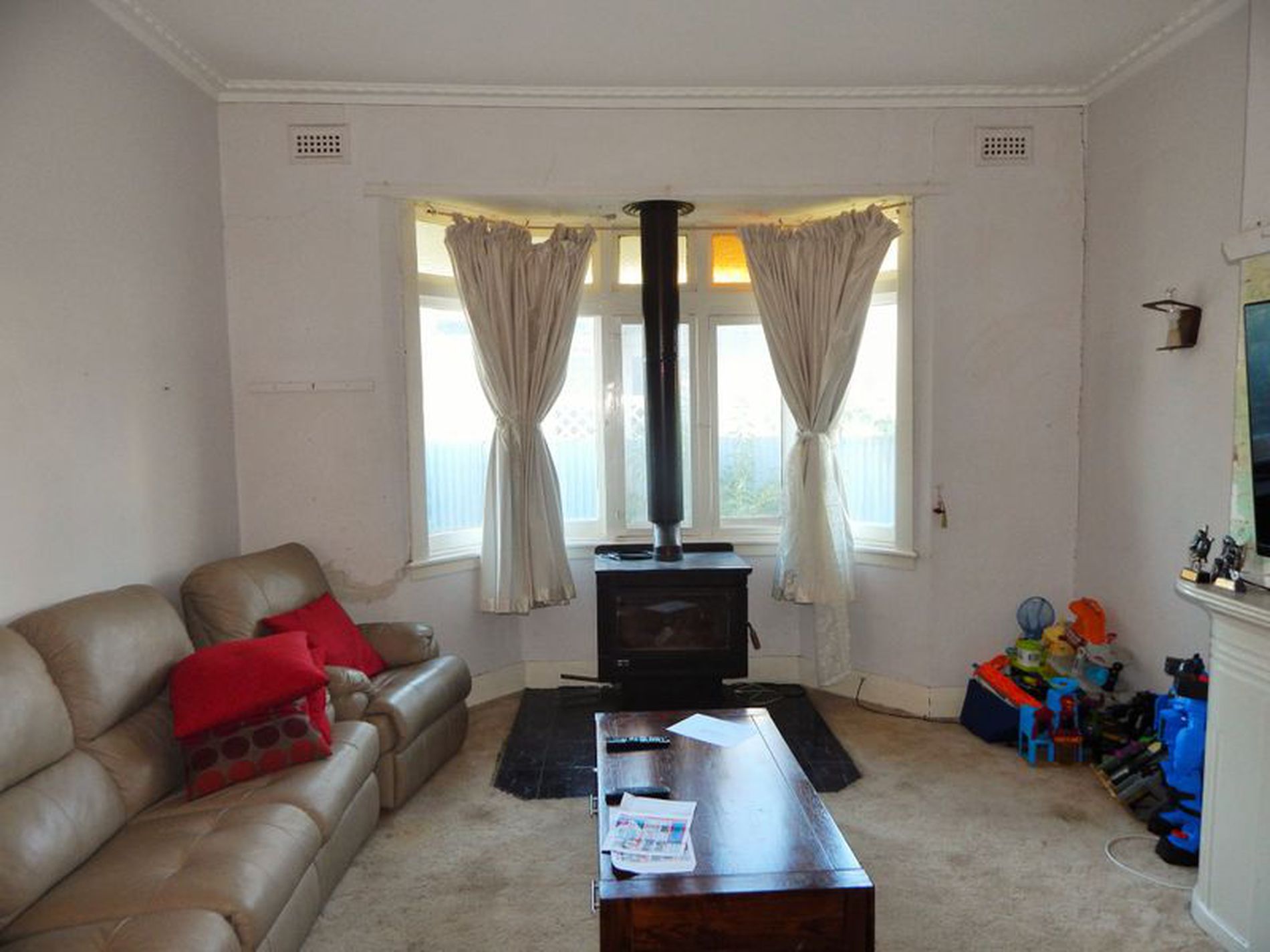• Separate carpeted living area with a bay window, wood heater and ducted a/c.