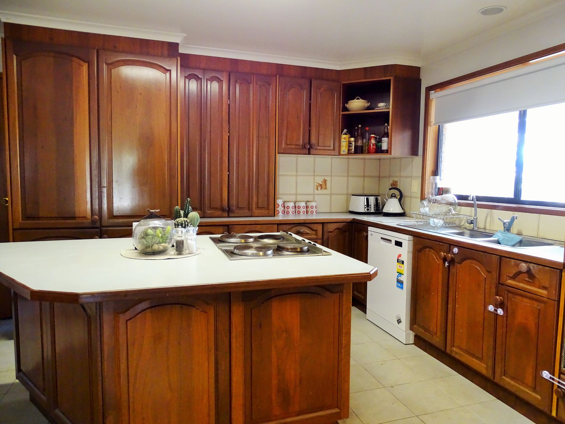 • The kitchen features an island bench with cook-top and timber cupboards.